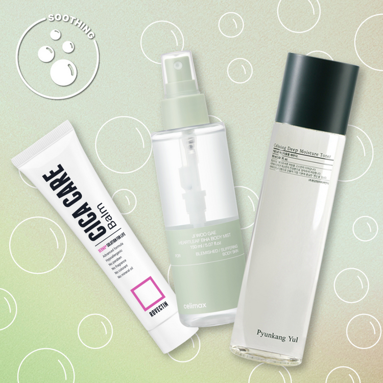 For those who don’t know where to start with sun aftercare, the BAZZAAL Box Soothing Trial Kit is just for you! These products' purpose is to provide fast and easy comfort to your skin from just three products. The Rovectin Cica Care Balm, Pyunkang Yul Calming Deep Moisture Toner, and the Celimax JIGWOOGAE Heartleaf BHA Body Mist all have soothing ingredients that help calm irritated skin.